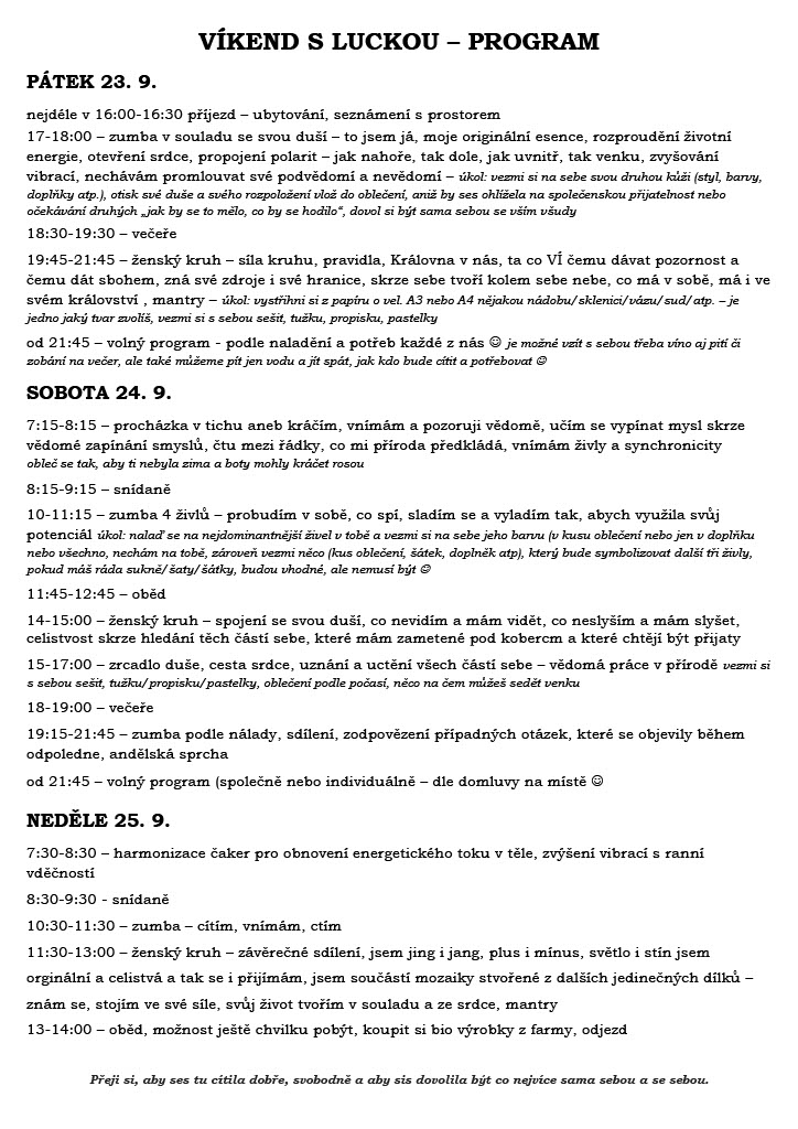 Už je to tady! Program na víkend! Časy jsou orientační, je možné, že se něco prostě přeskládá programově i časově jinak, buďme otevření všemu, co přijde, bude to správně. Též zkuste vypnout své vnitřní postavy - kritika, pochybovače, soudce, strašpytlíka, a raději se ptejte, pokud se vám přeci jen zapnou. Není špatné otázky. Dále se zkuste ladit na víkend už nyní tak, že budete k sobě co nejvíce laskavé, pečující, vědomé. Bude to váš posvátný čas, který si dáte sobě z lásky a veškerou práci, kterou pro sebe uděláte se otiskne i do prostoru kolem vás, veškerá uvědomění, která si z víkendu odvezete, s vámi půjdou i do vašich domovů a životů a veškeré čištění a léčení, které u vás proběhne, bude mít vliv na všechna vaše těla a bude mít pozitivní vliv i na vaše předky i potomky. Ať je náš záměr láskyplný, bezpečný, v souladu s božími zákony a vibračně a duchovně růstový. p.s. je to krátká doba na velké hloubky a velká skupina na individuální terapie, ale i letmé dotknutí bude mít vliv a své výsledky, už nyní ale vím, že víkendy budu dělat min. 2x do roka, protože víkendy se mnou jsou a budou intenzivní a zaslouží si, aby probíhaly pravidelně a v rámci sebepéče jich bylo více